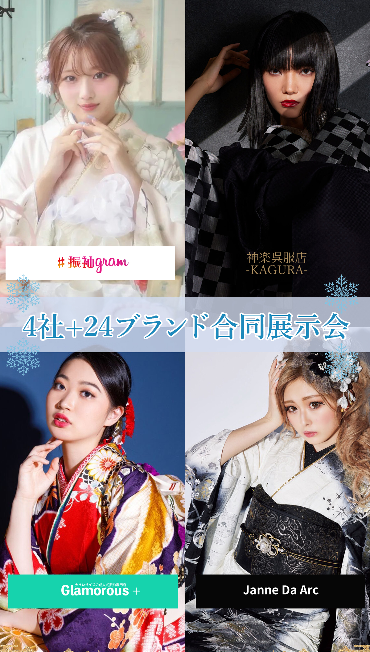 4社合同と振袖メーカー24のブランドの大展示会で最新商品をどこの店より安くレンタルと購入が可能です。古典柄振袖は京都限定品の京都までいなければ手に入らないものや展示会だけのオリジナル柄の1着限定柄の成人式着物も多数展示しております。お得に成人式の振袖をお求めの方は何があってもこちらの展示会をお勧めします。展示会が終了次第こちらのページは掲載終了しますが以下のリンクからそれぞれの店舗情報が見れます。