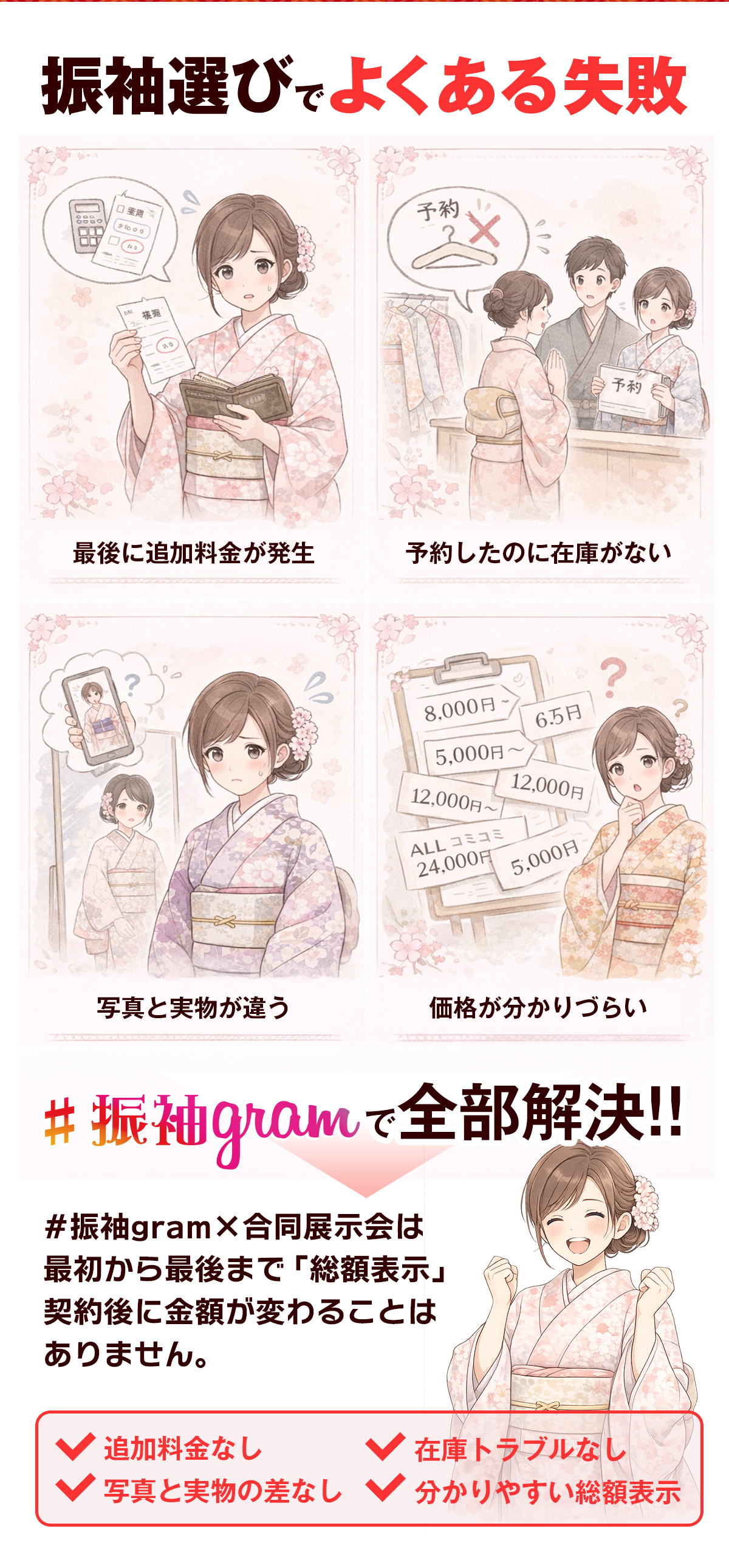 札幌・埼玉・名古屋・沖縄、それぞれの展示会には地域特性があります。 共通して言えるのは、価格だけでなく内容を理解して選ぶことが後悔しない振袖選びにつながるという点です。