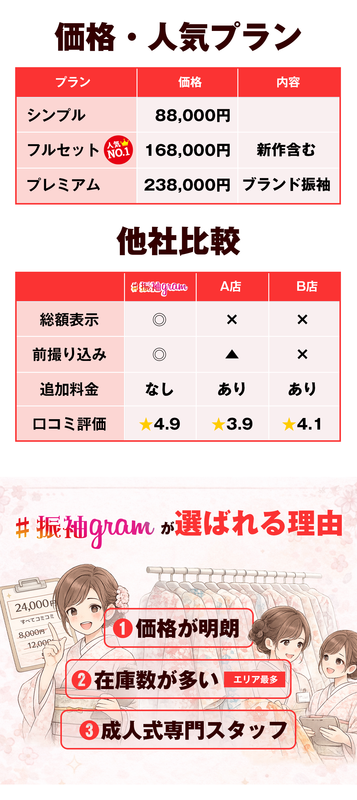 振袖展示会は、成人式準備の中でも最も重要な判断が求められる場です。 「安いと書いてあるけれど本当に大丈夫なのか」「札幌・埼玉・名古屋・沖縄では何が違うのか」といった疑問を持つ方は少なくありません。